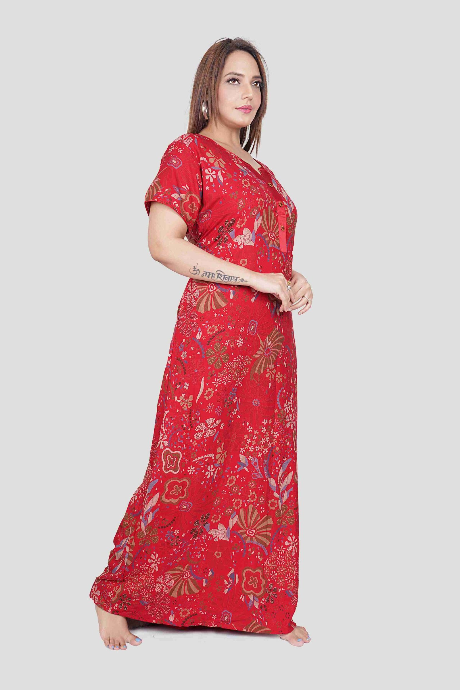 Indulge in the elegance of our nighty, crafted from premium alpine fabric known for its smooth texture, stunning luster, and natural sheen. Adorned with a tropical print and a chic buttoned neck, it features a convenient right-side pocket and a flattering “A” line silhouette. Ideal for loungewear, sleepwear, or special occasions, this nighty is designed for lasting beauty and effortless care, retaining its grace through every wash. Be sure to check our size chart to find your perfect fit.
