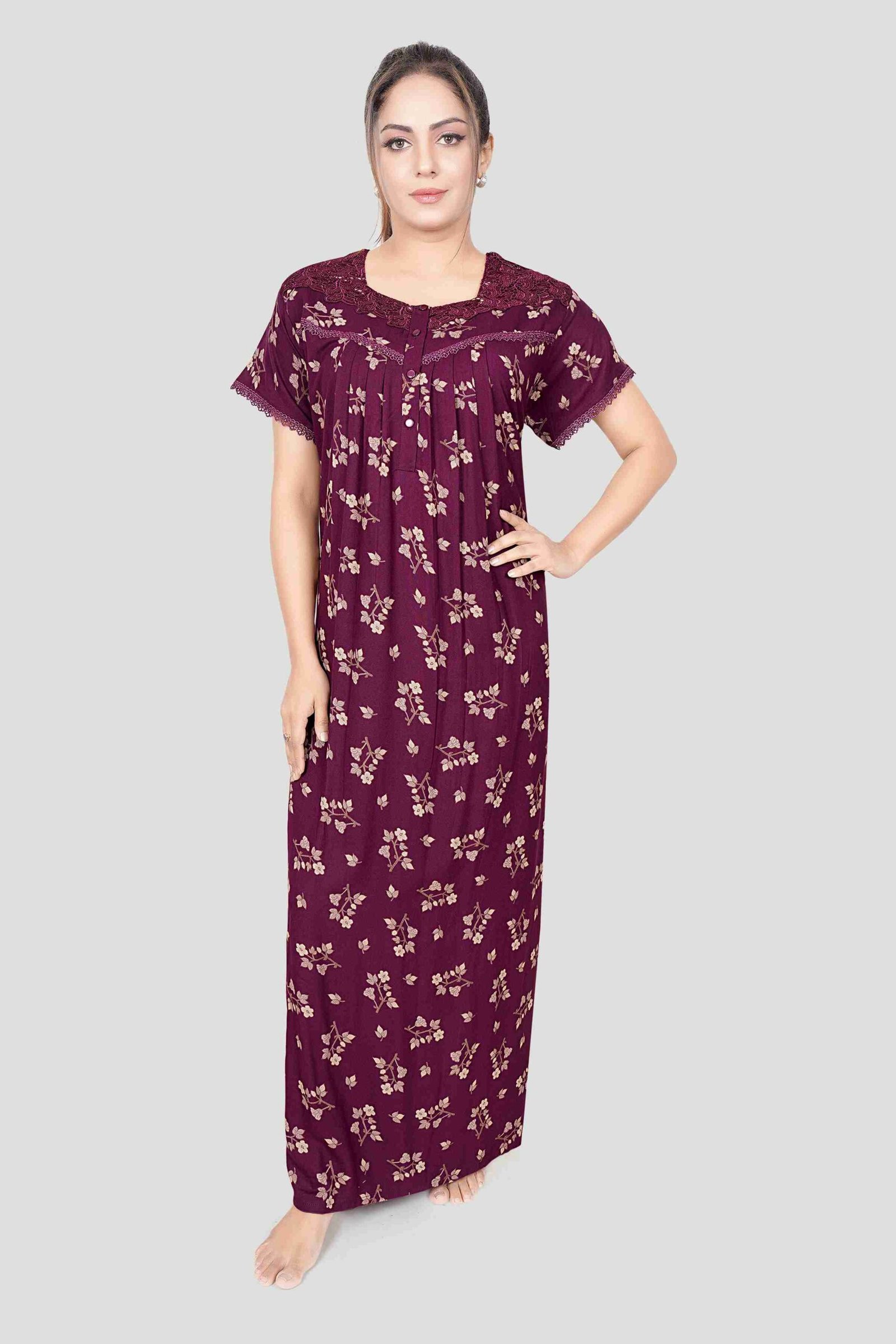 Beautiful Embroidery: The intricate embroidery on the sleeves and chest of our nighties adds a touch of elegance and class. These detailed designs enhance the overall beauty of our cotton gowns, creating a stunning visual effect.