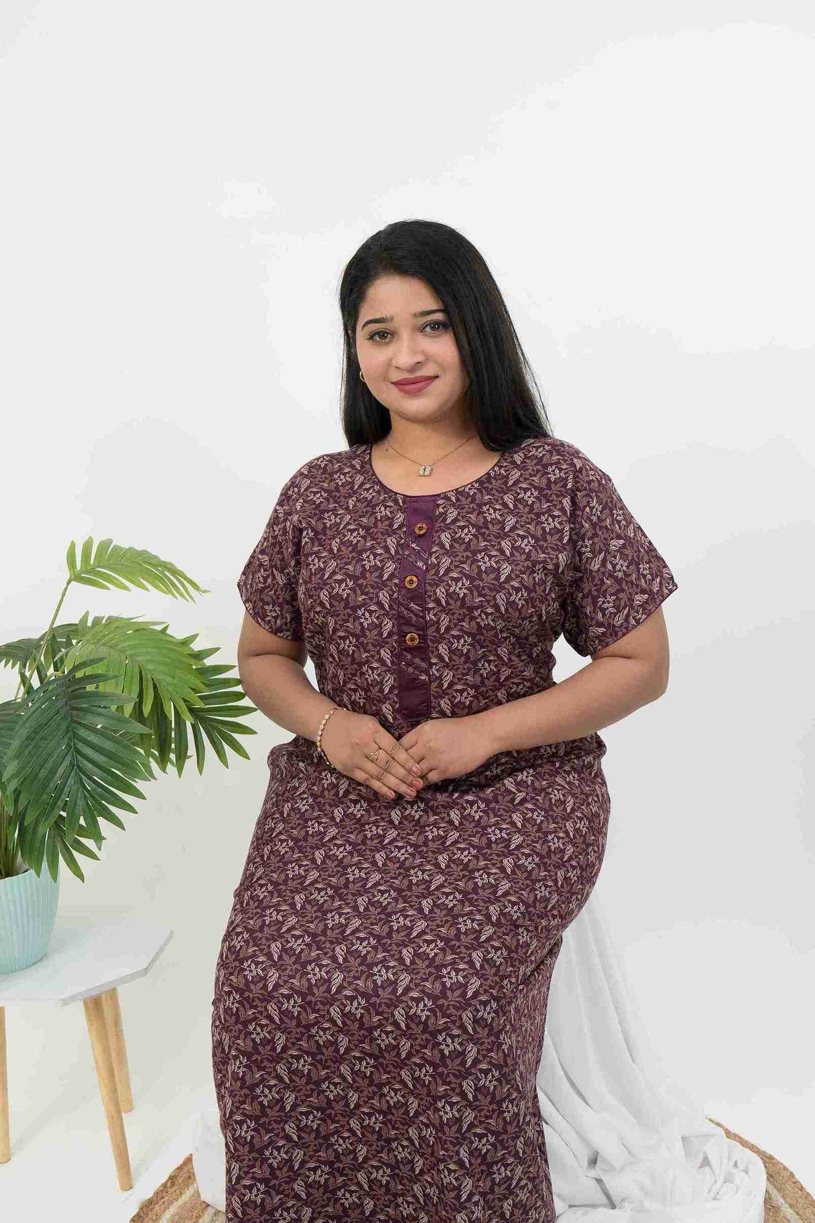 Indulge in the elegance of our nighty, crafted from premium alpine fabric known for its smooth texture, stunning luster, and natural sheen. Adorned with a tropical print and a chic buttoned neck, it features a convenient right-side pocket and a flattering “A” line silhouette. Ideal for loungewear, sleepwear, or special occasions, this nighty is designed for lasting beauty and effortless care, retaining its grace through every wash. Be sure to check our size chart to find your perfect fit.